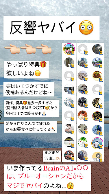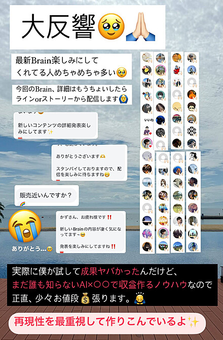また、本Brain購入者には、僕が前回のBrainで月100万の売上を作ったインスタのストーリーズを50枚以上の解説付きで購入者特典として配布します。