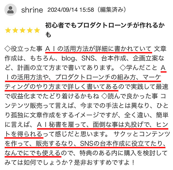 有益すぎて本当にこの価格での販売でよかったの?と思いました。AIによる作成のためのプロンプトが具体的でありがたすぎます。このプロンプトあればすぐに実践できますね( ¨̮ ) AIも少し前までChatGPTが1番と言われてたはずなのに今はさらに良いものがすでに出てきているなんて。。。こちらのコンテンツ読んでChatGPTの課金やめて、すぐにクロードの課金に乗り換えました(笑) 前回購入した「AI×SNS」のコンテンツもそうだったんですが、これならできる‼️やれる気がする、やってみようと思えました。マーケティングを実践するのは今の自分には難しいかなと思ったりもしましたが、コツコツ積み重ねて行けば、このノウハウ通りに行動目標すれば目標達成できる、自分が描く理想の未来に手が届くと確信出来る内容でした。このノウハウあれば絶対成果出せると思うので諦めずに継続していきます(*´`)