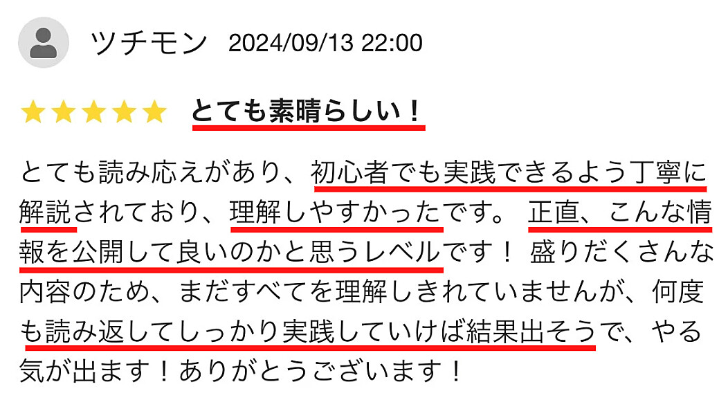 とても読み応えがあり、初心者でも実践できるよう丁寧に解説されており、理解しやすかったです。 正直、こんな情報を公開して良いのかと思うレベルです! 盛りだくさんな内容のため、まだすべてを理解しきれていませんが、何度も読み返してしっかり実践していけば結果出そうで、やる気が出ます!ありがとうございます!