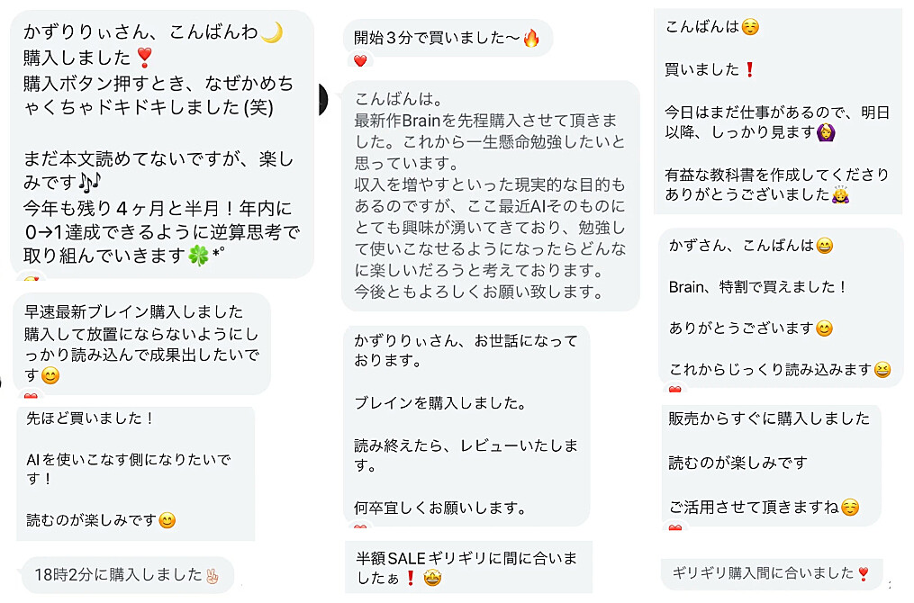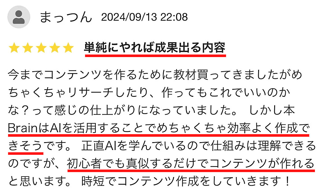 今までコンテンツを作るために教材買ってきましたがめちゃくちゃリサーチしたり、作ってもこれでいいのかな?って感じの仕上がりになっていました。 しかし本BrainはAIを活用することでめちゃくちゃ効率よく作成できそうです。 正直AIを学んでいるので仕組みは理解できるのですが、初心者でも真似するだけでコンテンツが作れると思います。 時短でコンテンツ作成をしていきます!