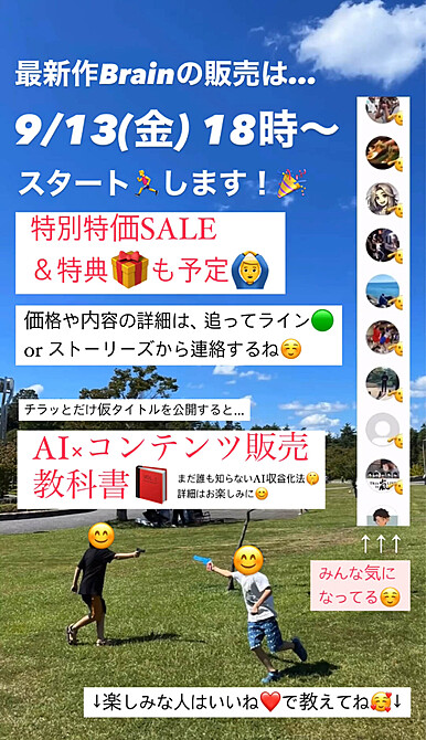 9/13に僕がこの本Brainを販売開始することにより、"AI×コンテンツ販売"が確実に世の中に一気に広がります。