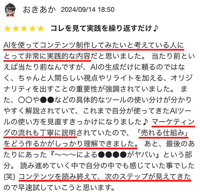 AIを使ってコンテンツ制作してみたいと考えている人にとって非常に実践的な内容だと思いました。 当たり前といえば当たり前なんですが、AIの生成だけに頼るのではなく、ちゃんと人間らしい視点やリライトを加える、オリジナリティを出すことの重要性が強調されていました。 また、〇〇や●●などの具体的なツールの使い分けが分かりやすく解説されていて、これまで自分が使ってきたAIツールの使い方を見直すきっかけになりました♪ マーケティングの流れも丁寧に説明されていたので、「売れる仕組み」をどう作るかがしっかり理解できました。 あと、最後のあたりにあった『~~~による●●●●がヤバい』という部分。 読み進めていく中で自分の中でも感じていた事でした(笑) コンテンツを読み終えて、次のステップが見えてきたので早速試していこうと思います。