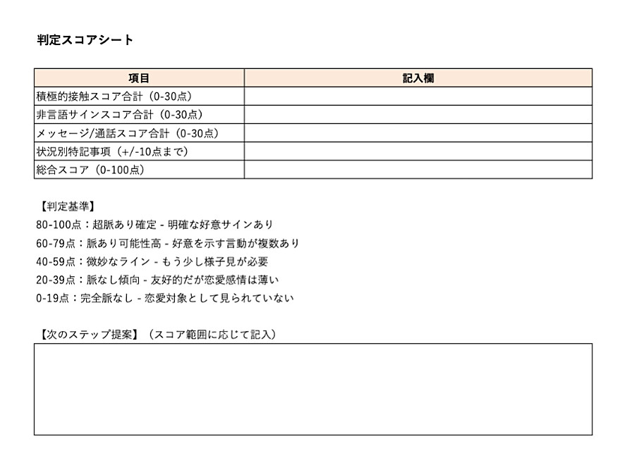 相手の言動や非言語サインを数値化して客観的に評価し、恋愛対象としての関心度を科学的に判定するスコアリングシステム。