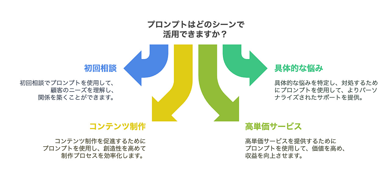 このプロンプト集は、その掛け合わせを最大化するために厳選された実践的ツールです。これからの恋愛アドバイスビジネスで成功するための必須アイテムと言えるでしょう。