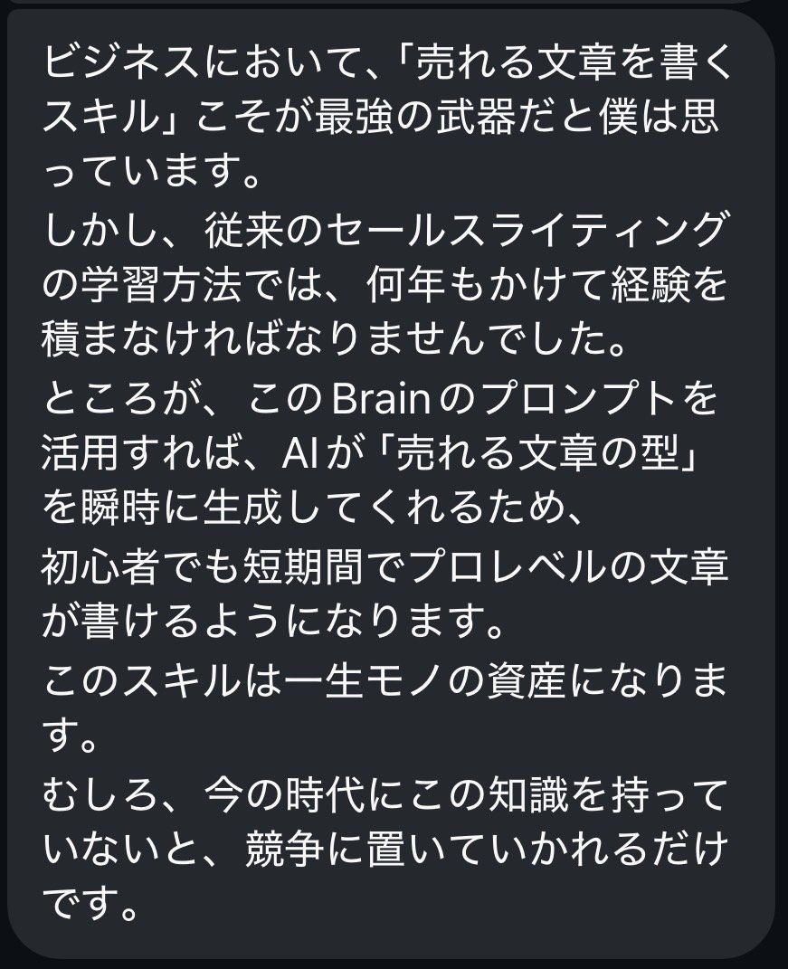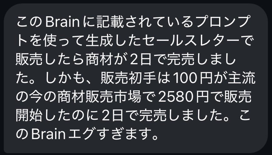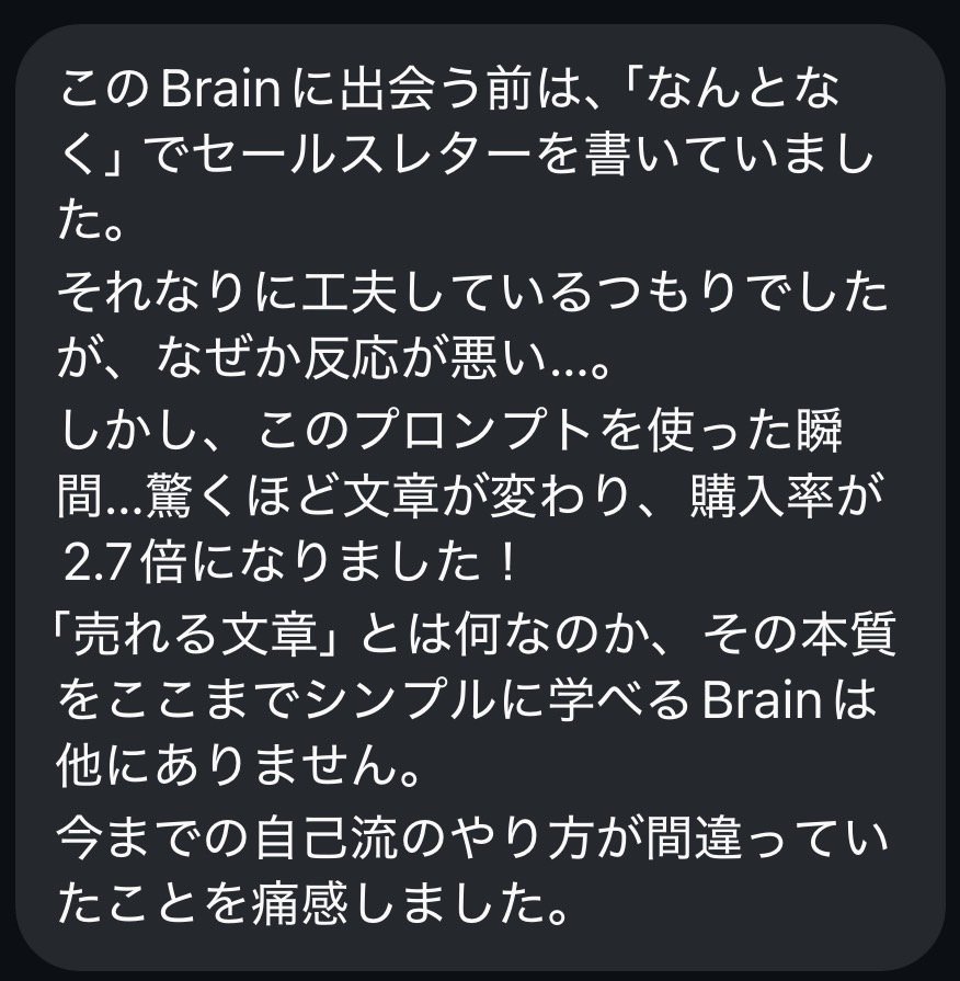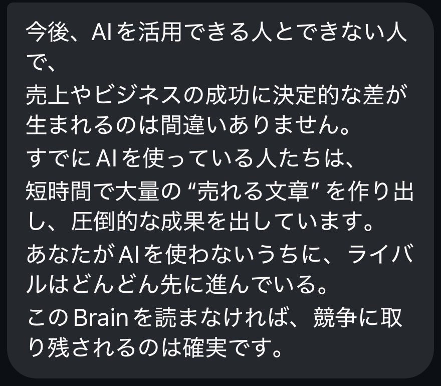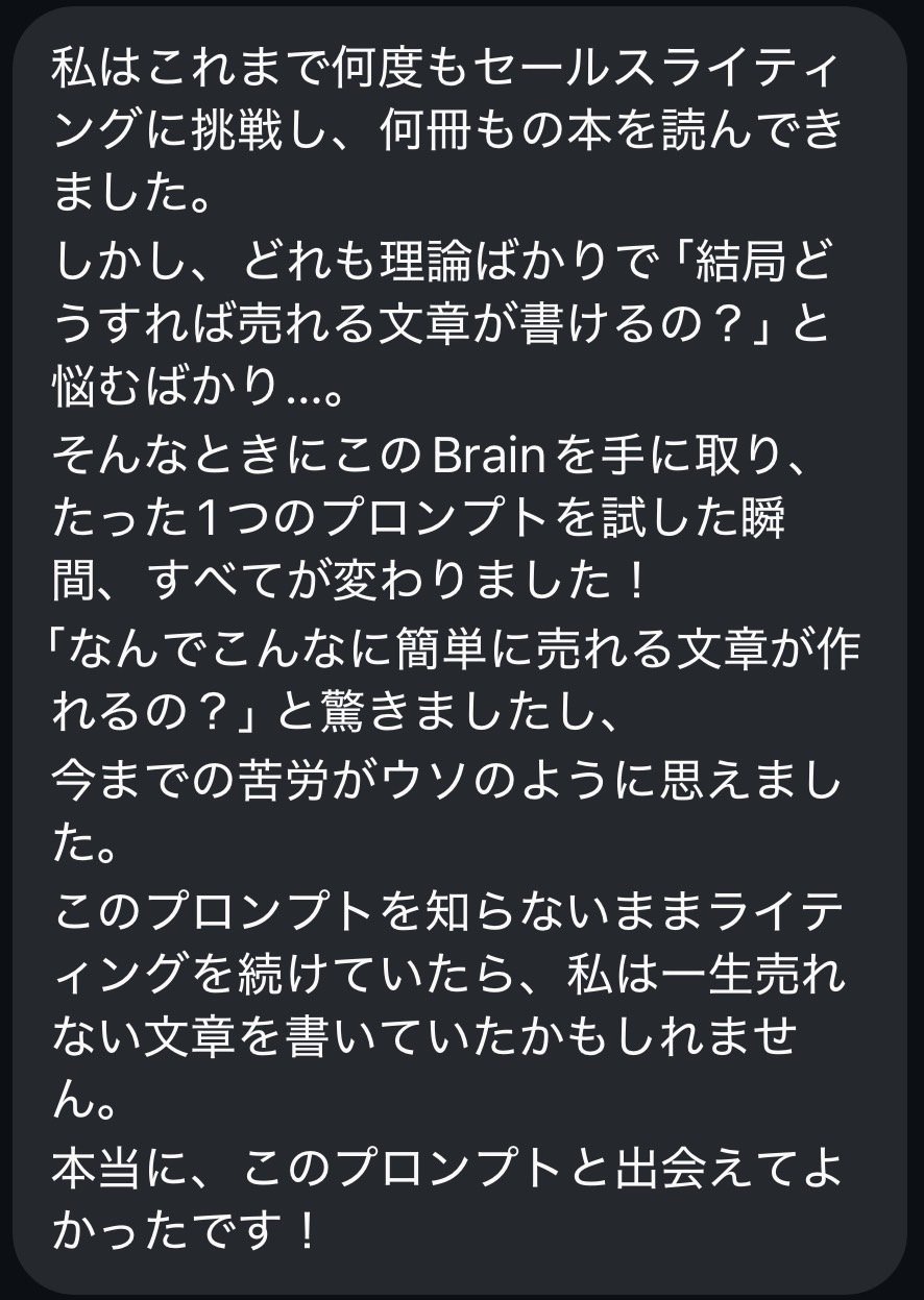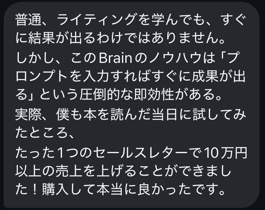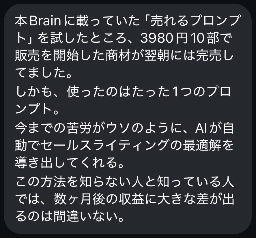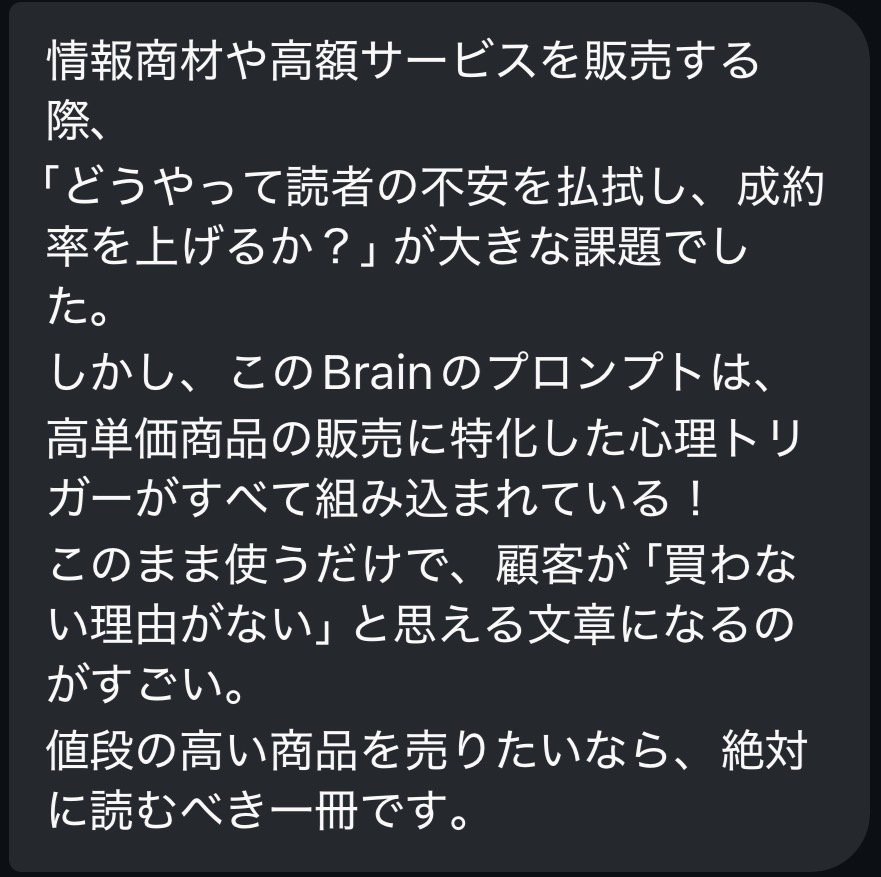 本Brain『最強AIプロンプト大全』では、情報商材・高単価商品の購入率を劇的にUPさせるための実践的なノウハウを提供しています。